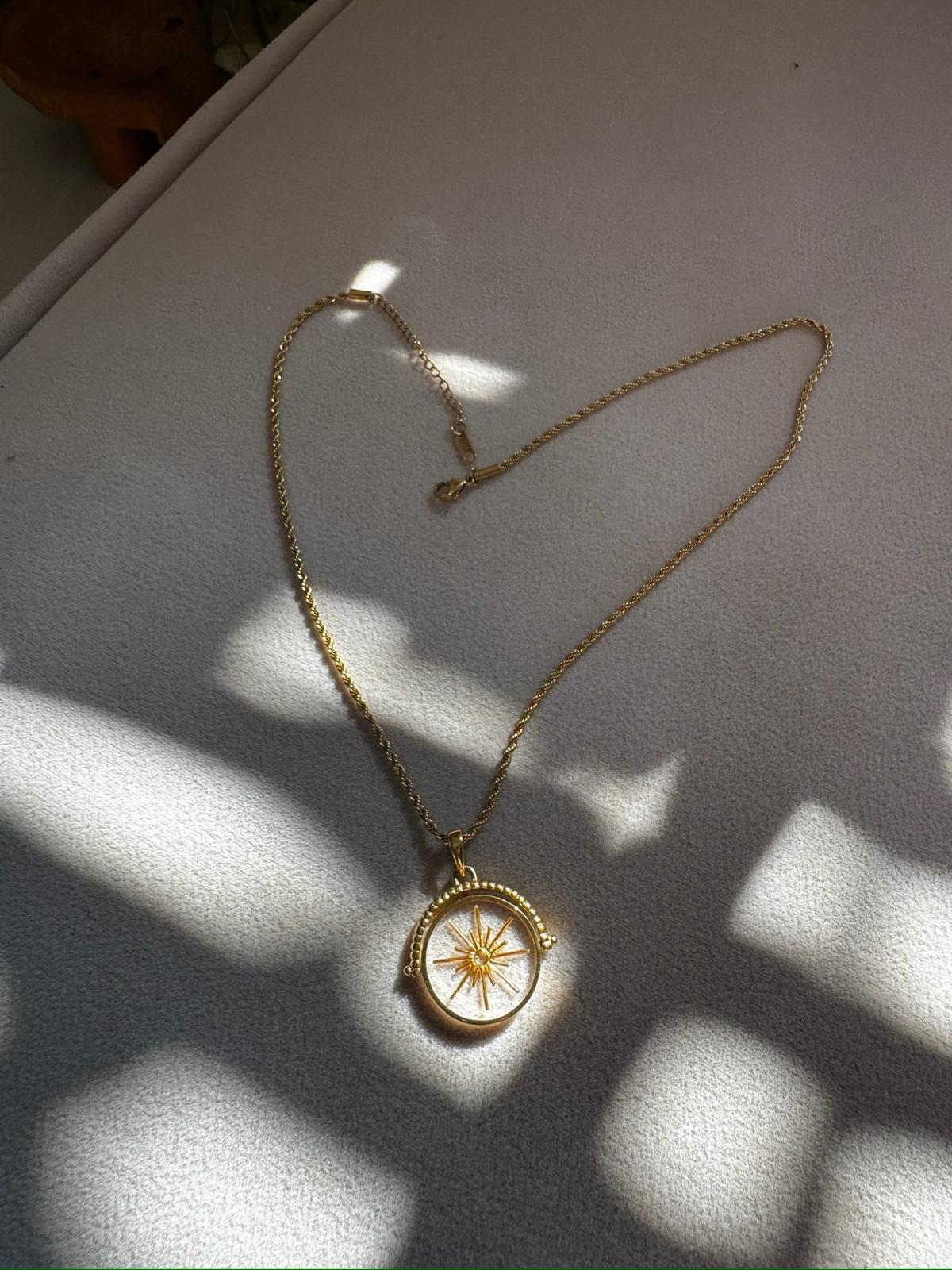 Elevated with our signature sun motif, this necklace is designed to bring a warm, luminous touch to your everyday styling. The pendant and chain blends 18 kt gold vermeil and bronze with a soft resin center, creating a gentle glow when it catches the light. It is a timeless piece meant to layer effortlessly or stand alone as a quiet statement.