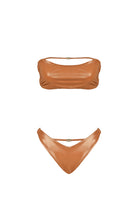 AYA Wet Brown Bikini is your go-to choice for a fashionable pool party. The glossy brown shade gives off an elegant, luxurious vibe, while the gold hardware adds just the right touch of glam. Finished with string details and gold accessories on both the bandeau top and the panty, this look is made to turn heads.