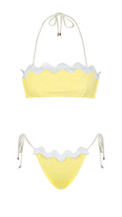 TROPICA two-piece bikini brings a special element of Aanoukis’s TROPICA family: the waving detail of the hemline on both the top and the panties. In a soft terry mimosa yellow hue, this bikini offers a playful yet stylish look, making it the perfect choice for a refreshing dip and fun beach moments under the sun.