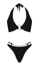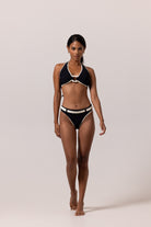 Inspired by retro styles, the URSULA 2P two-toned bikini in classic black and ivory will complement any body type. Featuring high-rise panties and a timeless halter silhouette, this bikini is designed to flatter. Accented with a contrasting white belt at the waist, it adds a touch of allure and definition to your swimwear look.