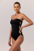 A fashionable pool party? AYA bikini should definitely be your choice. The black color gives you an exquisite glam look while the gold hardware adds some fancy touches. To complete it all, a string detail with gold accessory on the bandeau top and the panty. Let your party glamorously begin.