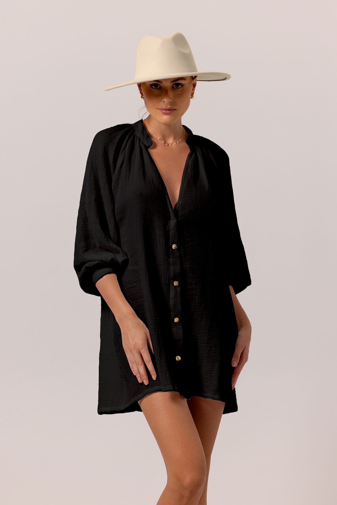 An effortless day calls for an effortlessly chic dress that you can slip away and look gorgeous nevertheless. Introducing LA PLAGE MINI DRESS that certainly be your next wardrobe staple. Deep v-neckline to flatter your upper figure, 3/4 sleeves, and loose-cut. Versatile yet modern with a classy black color.