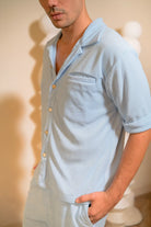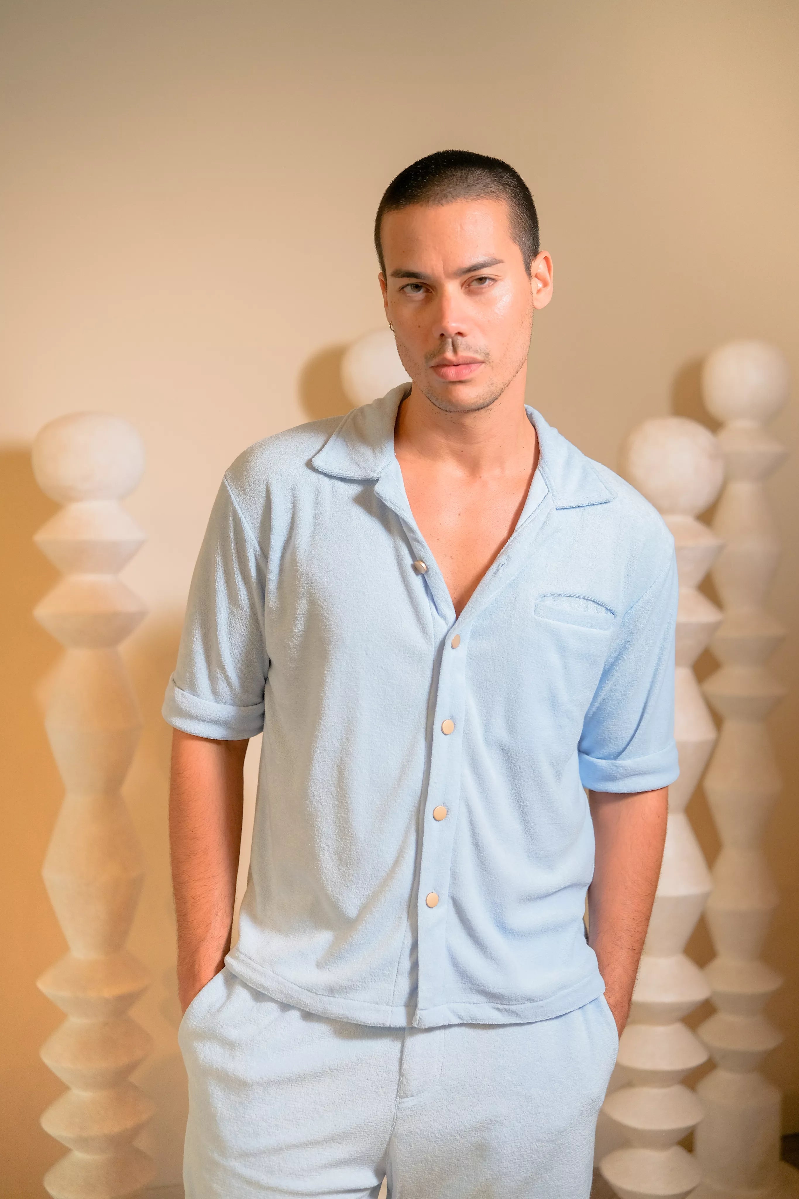 Chill out in style with the ANDREAS TOP, a men's terry cloth shirt in soft blue. This relaxed-fit top features a collared neckline, folded mid-sleeves, and flat buttons for a laid-back look. The soft terry fabric is comfortable against your skin, while the fake pocket details add a touch of visual interest. Perfect for the beach, lounging by the pool, or everyday wear, the ANDREAS TOP is a versatile addition to your wardrobe.