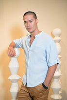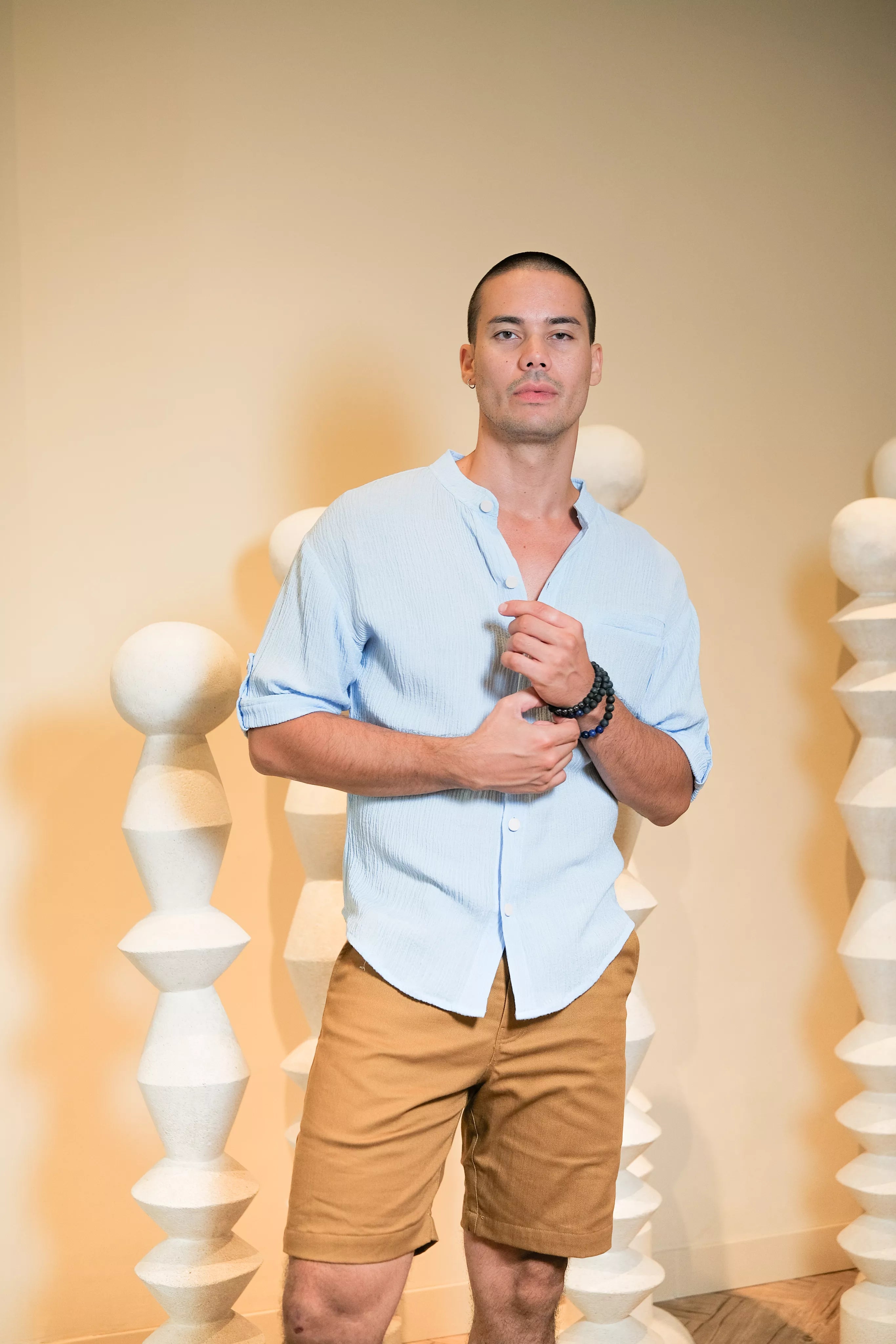 Elevate your style with the APOLLON SHIRT, a men's shirt that goes from casual to dressy. This versatile shirt is crafted from lightweight, breathable fabric for all-day comfort. The mandarin collar and folded sleeves add a touch of modern flair, while the flat buttons provide a subtle design detail. The APOLLON SHIRT is a must-have for any man's wardrobe.