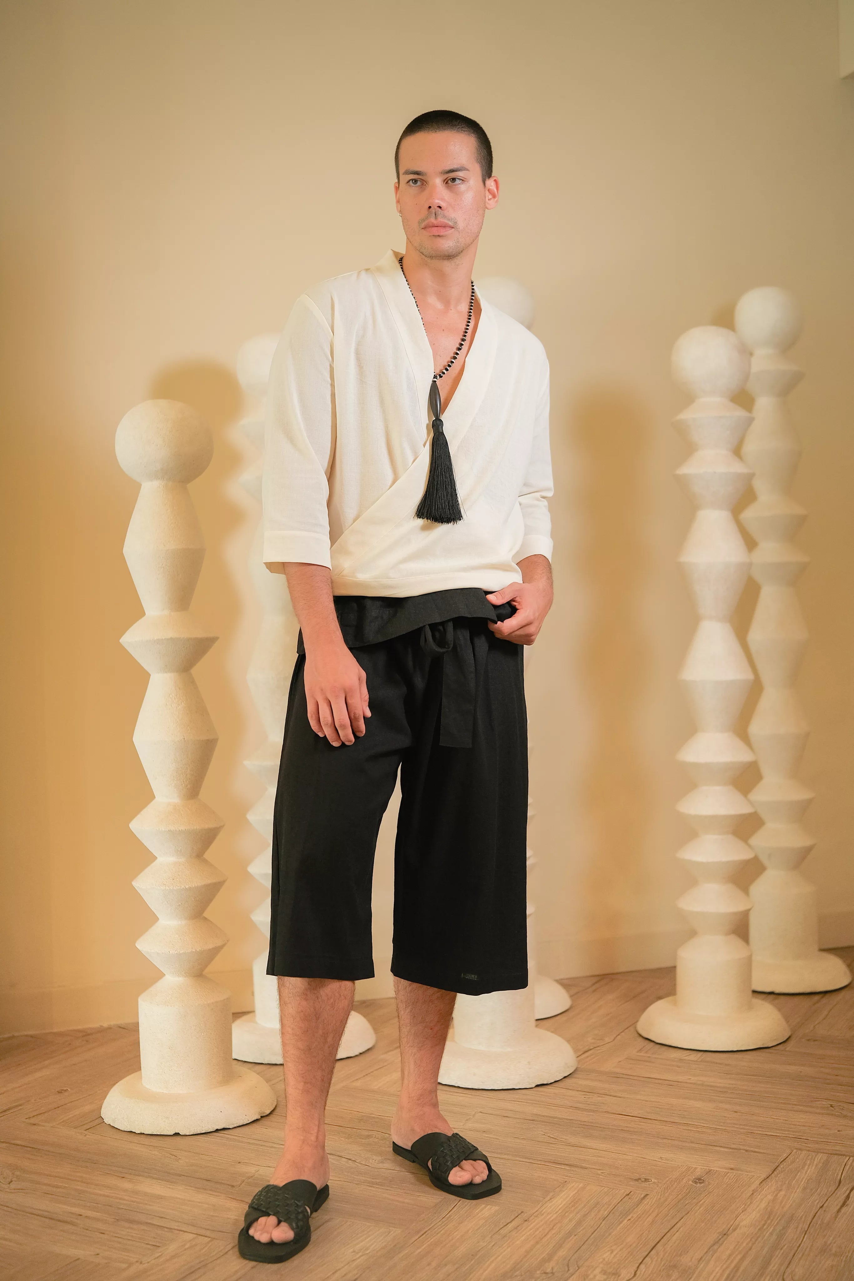 - Wrap mid-length pants with a removable belt