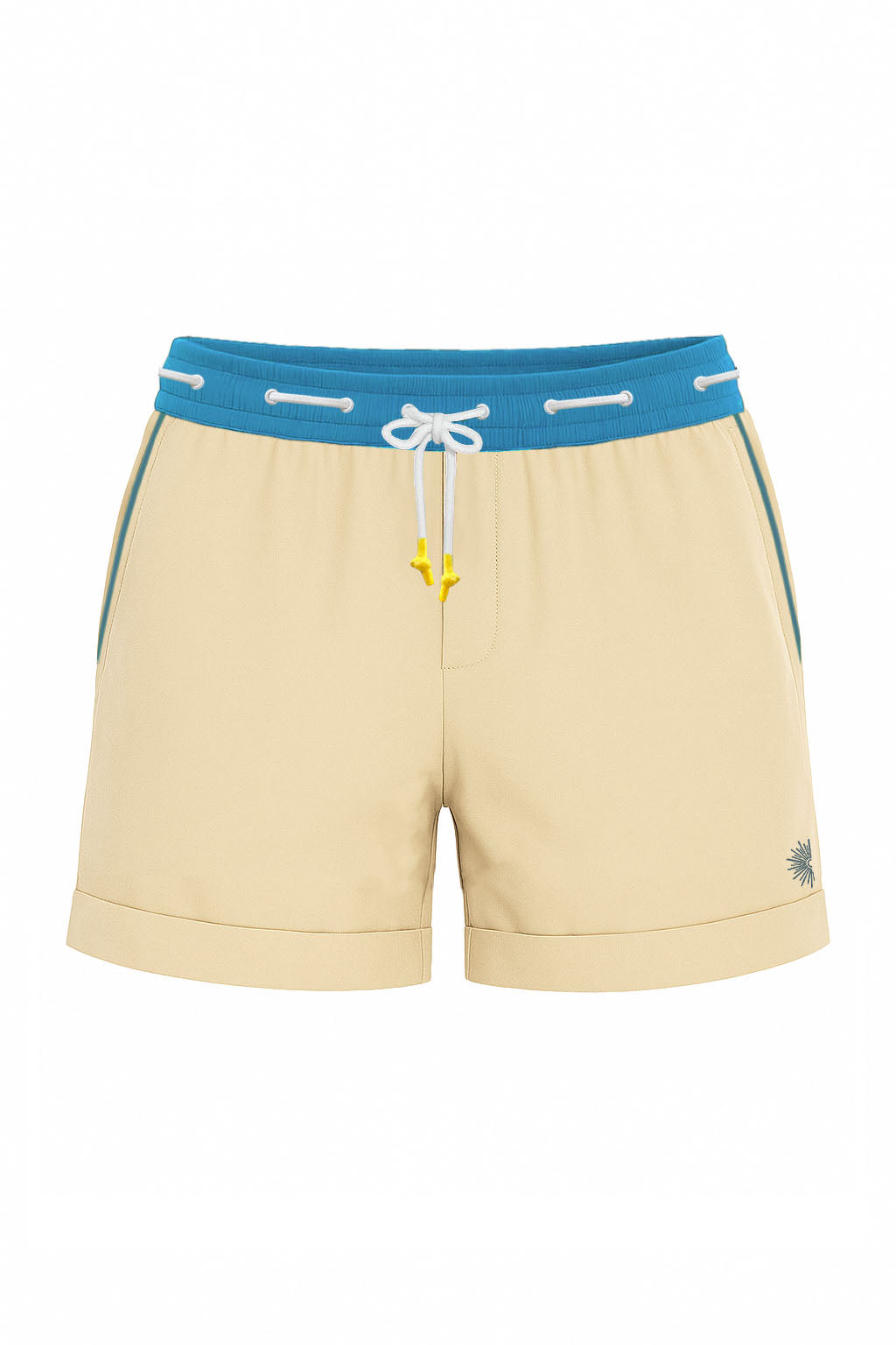The KANO TRUNK in Beige/Coastal Blue combines sustainability with functionality. Crafted from recycled stretch fabric, this shorter-length swim trunk ensures comfort and eco-awareness for your summer excursions. It offers both practical convenience and refined style for the conscious wearer.