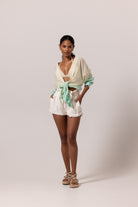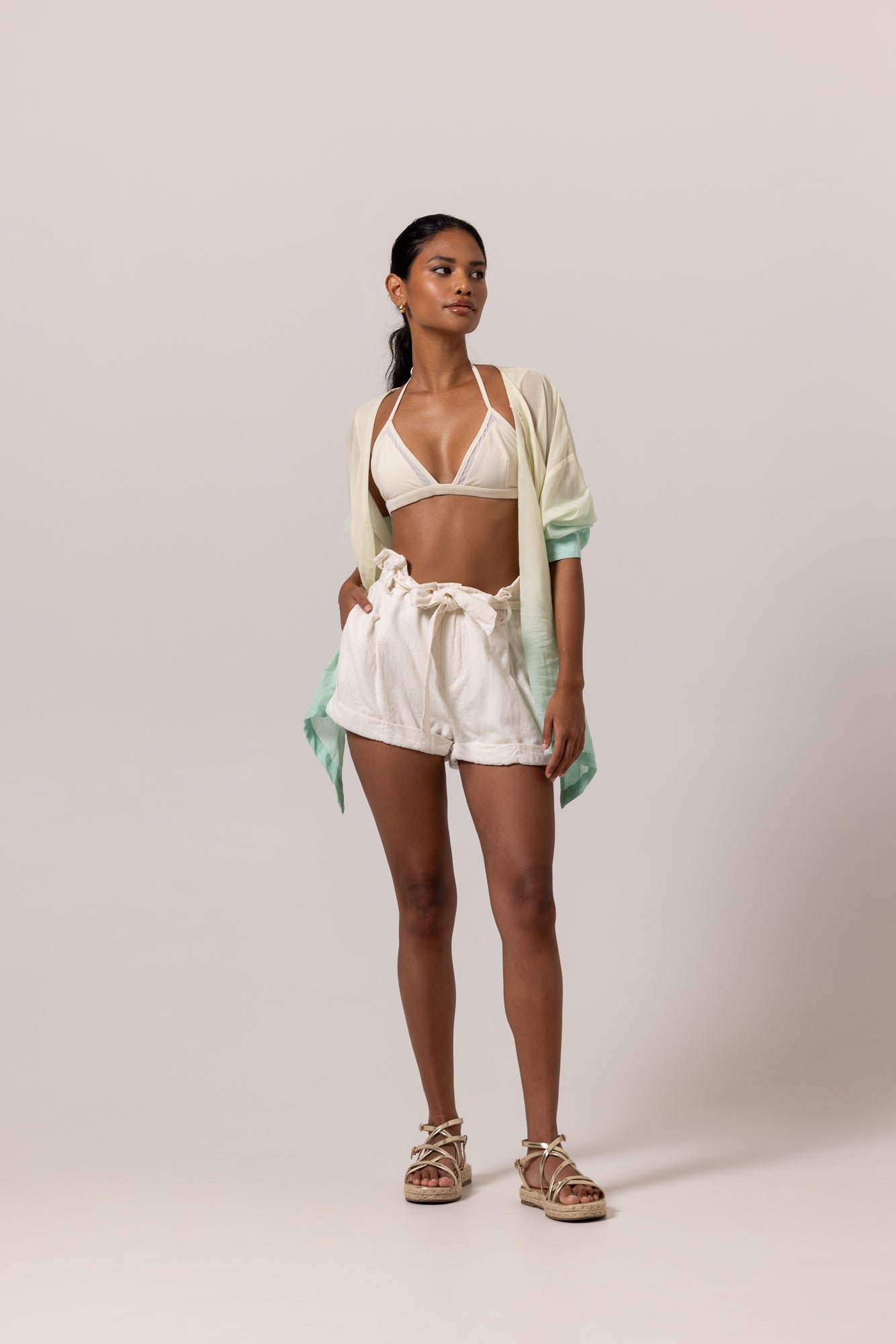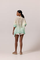 AKIRA TOP is a versatile shirt is made of soft lightweight cotton with ivory-aquamarine gradation color. It has an oversized silhouette and a slightly sheer look, completed with long sleeves and buttons at the front.