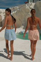 A skirt and bikini bottom coverups at one piece so you don't have to choose. BONITA MINI SKIRT comes in a soft Cotton Terry fabric in a baby blue color. Transparent glass rings accent at the side complement your flirty, très élégante look.