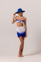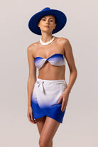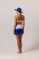 An upgrade of a basic wrap skirt. This petite skirt is an innovation for an easy cover on the beach or pool day. Comes in a soft drapey fabric in dip-dyed in white-blue ombré colorway with adjustable side straps. Wrap around your hips to get a chic effortless look.
