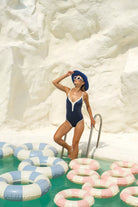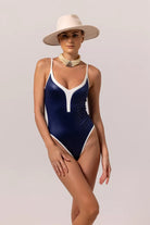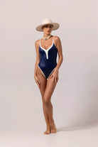 Chanelling your inner Audrey Hepburn with fabulous VERA one-piece. High-leg cut and adjustable thin straps to flatter your curves. Comes in a sophisticated Prussian blue with white hems, this one will give moderate coverage while celebrating your feminine shapes.