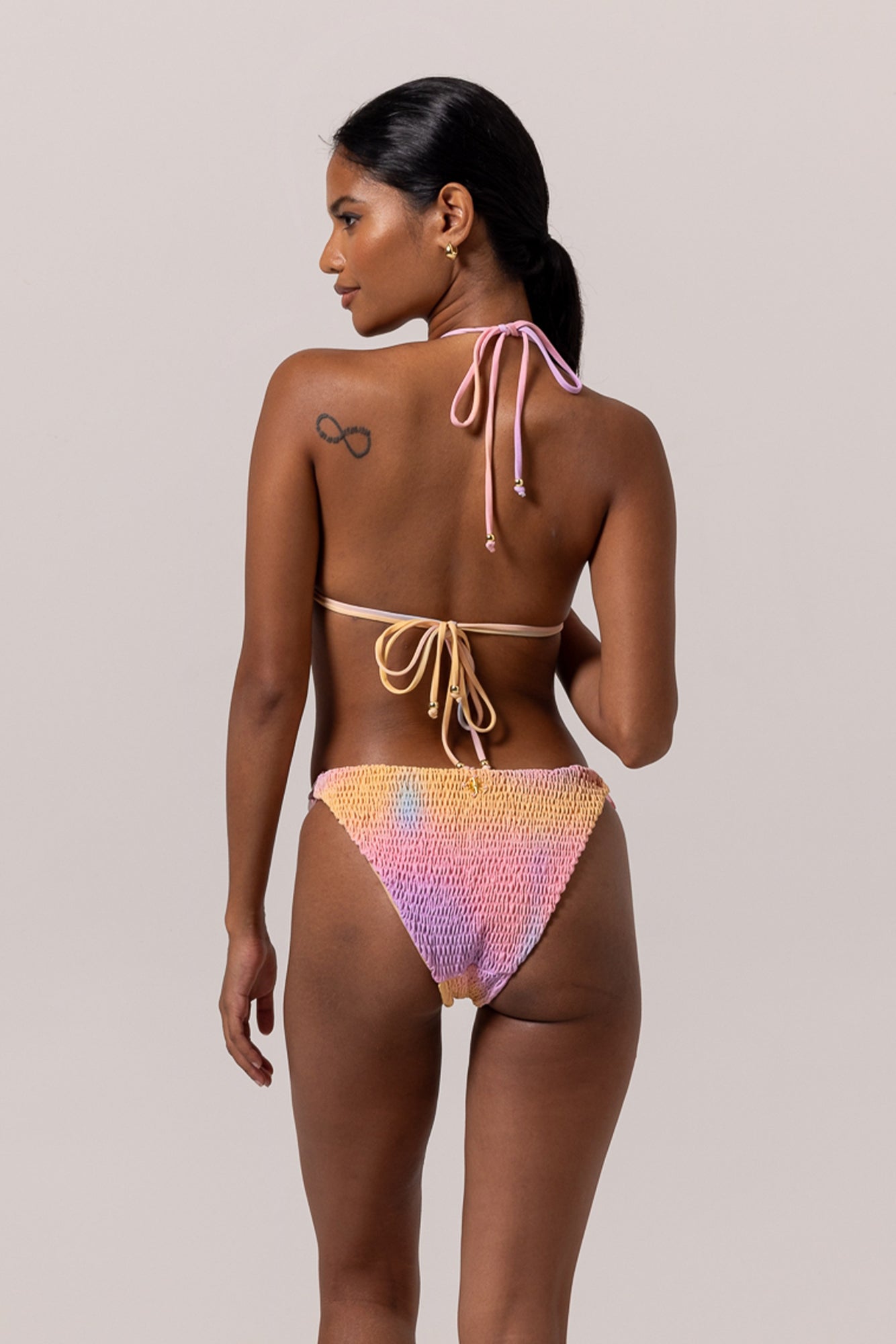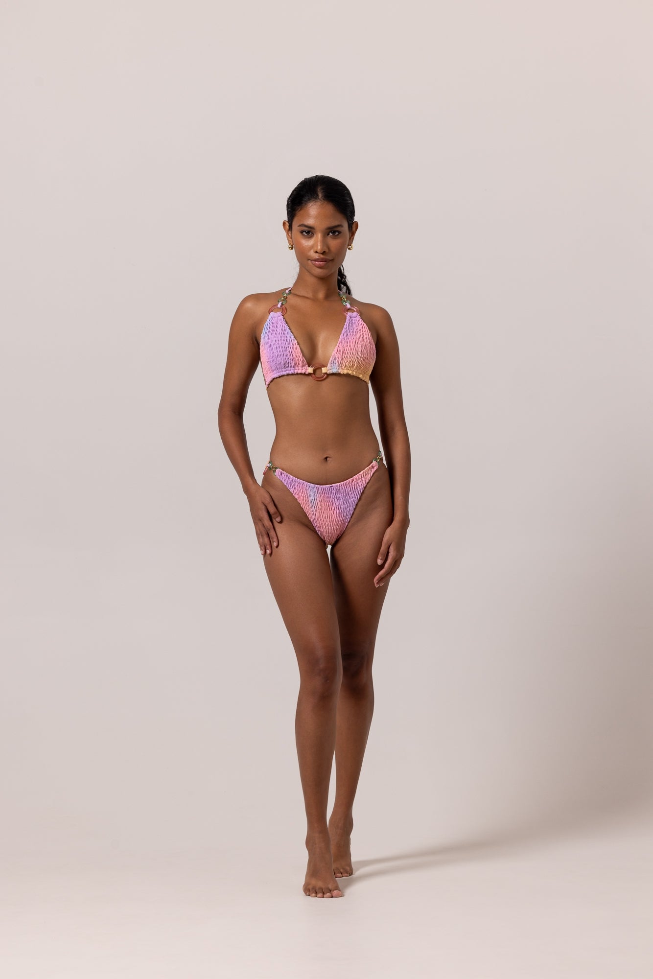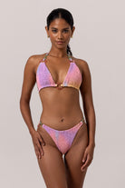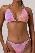 Freshen up your beach look with this pink SUNSET SMOKE Bikini, inspired by our Bali lifestyle. Show off your tan in the colorful triangle top and panty set made by a smoked soft fabric. Embellished with a set of stylish coloured rings. You'll be sure to turn heads in the playful sun-kissed and ocean colors.