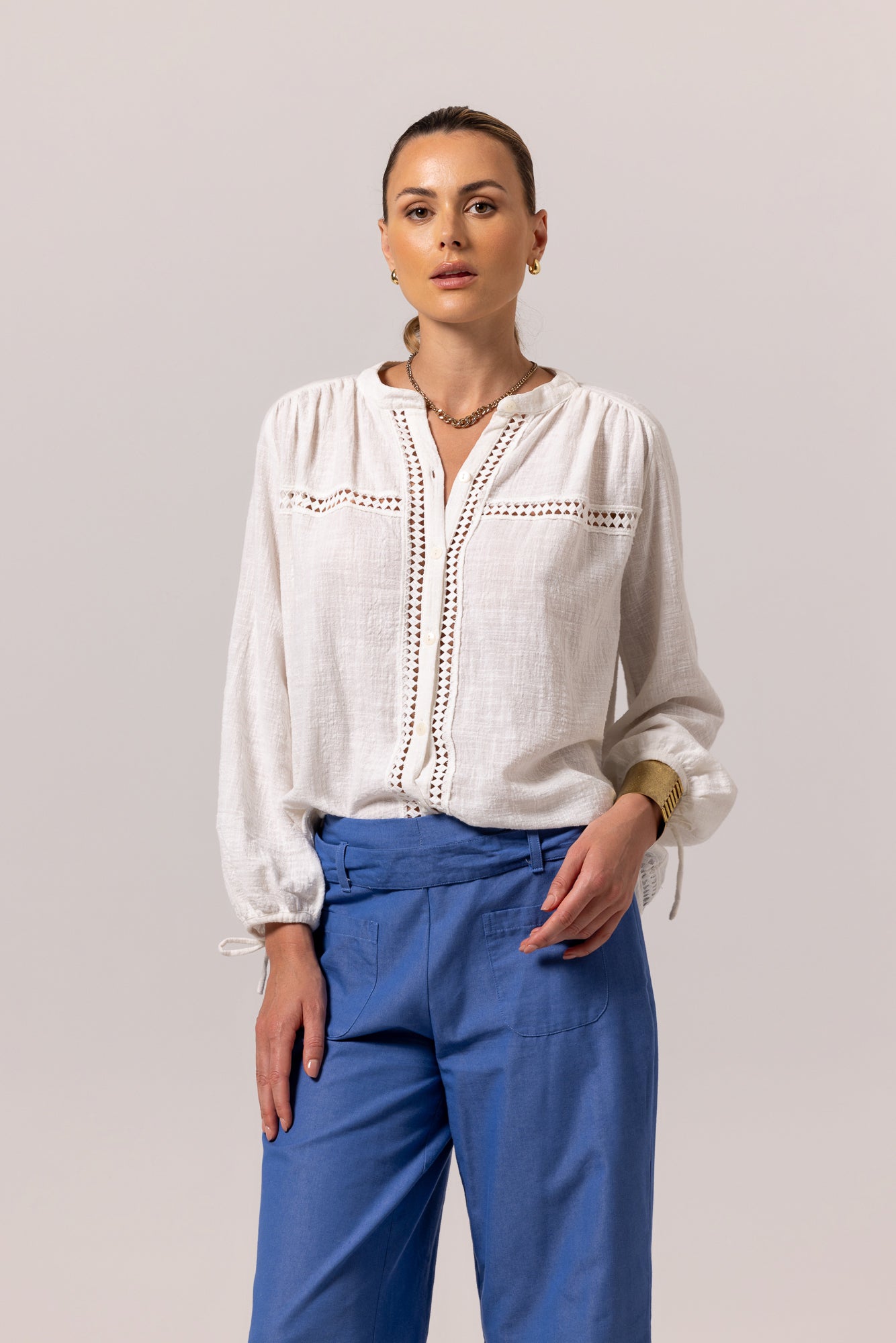 Que vous vous prélassiez dans votre station balnéaire préférée ou que vous retourniez précipitamment à votre vie quotidienne, BOHO BLOUSE est conçu pour vous garder chic dans tous les cas. Le col mandarin et la coupe ample avec un tissu en coton doux ivoire donnent une ambiance bohème décontractée tandis que les détails à œillets apportent une touche intéressante de « fenêtre respirante » à votre corps.