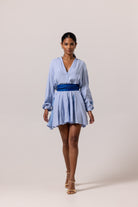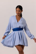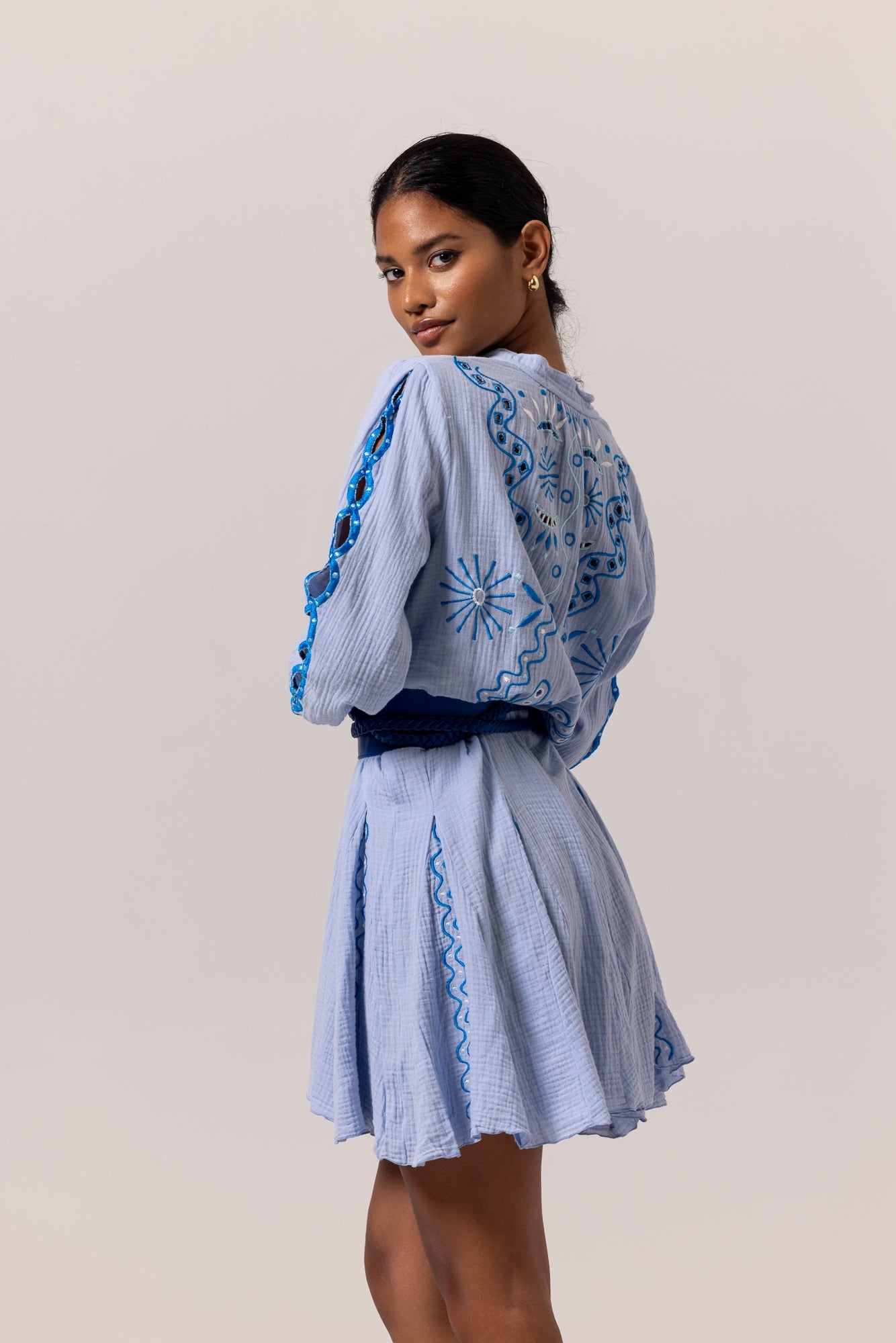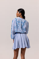 "La ROBE PAPILLON n'est pas une robe élégante ordinaire. Retournez-vous et vous verrez les détails de broderie artistique qui ressemblent à l'été et au symbole solaire emblématique d'AANOUKIS dans le dos. Les détails à œillets avec des ourlets contrastés sur le côté des manches apportent une touche ludique. Disponible dans une couleur bleu clair apaisante, vous serez impressionné par ce tissu en coton texturé respirant et beurré.