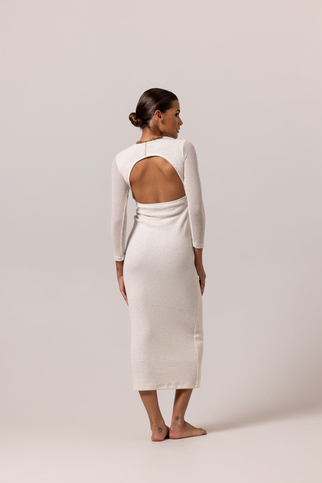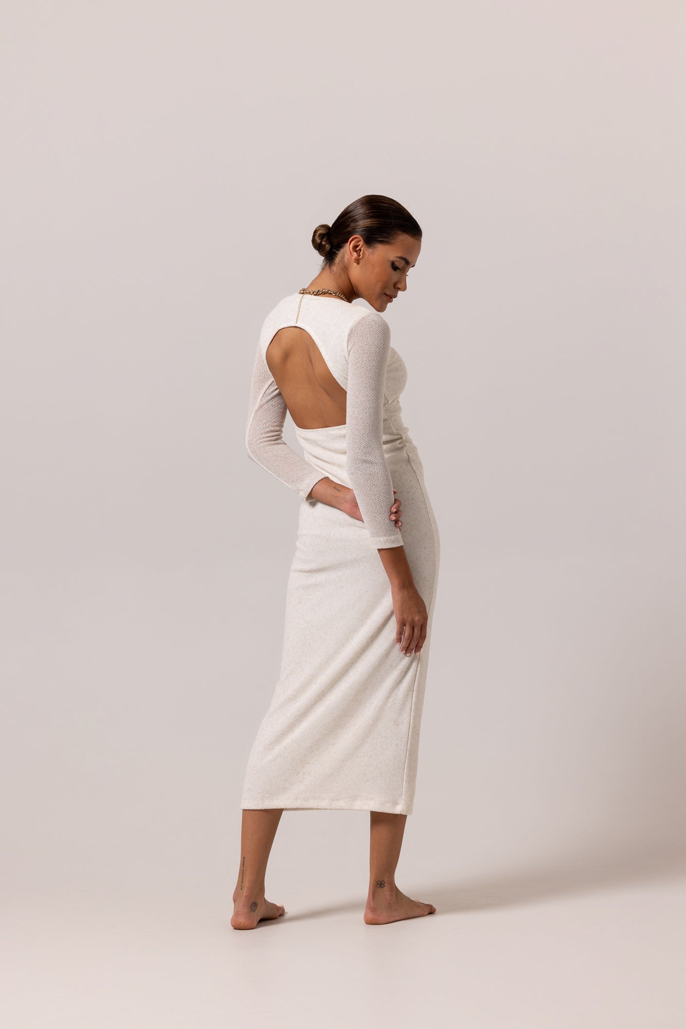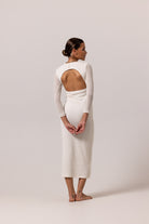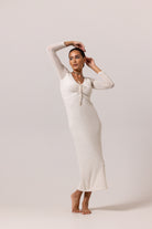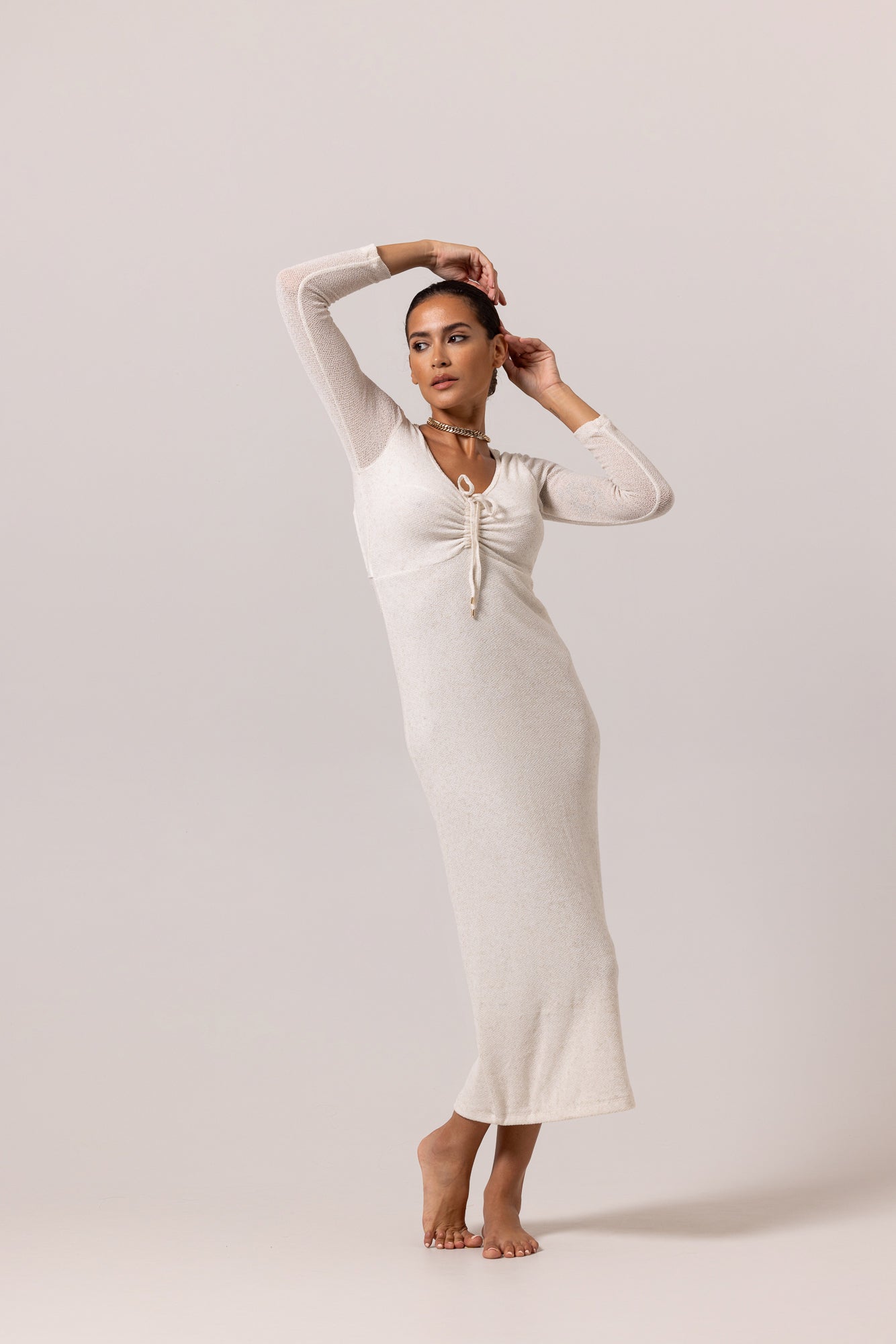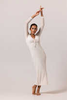 La robe longue CINDERELLA est la solution pour un look de jour rapide et raffiné. Un décolleté en V bas avec un buste froncé et un détail dos nu est une ode à vos courbes féminines. Finition avec une bretelle à lacets pour une touche douce subtile. Disponible dans une couleur blanche neutre, parfaite pour une saison estivale, et des manches longues ajustées pour un look soigné.