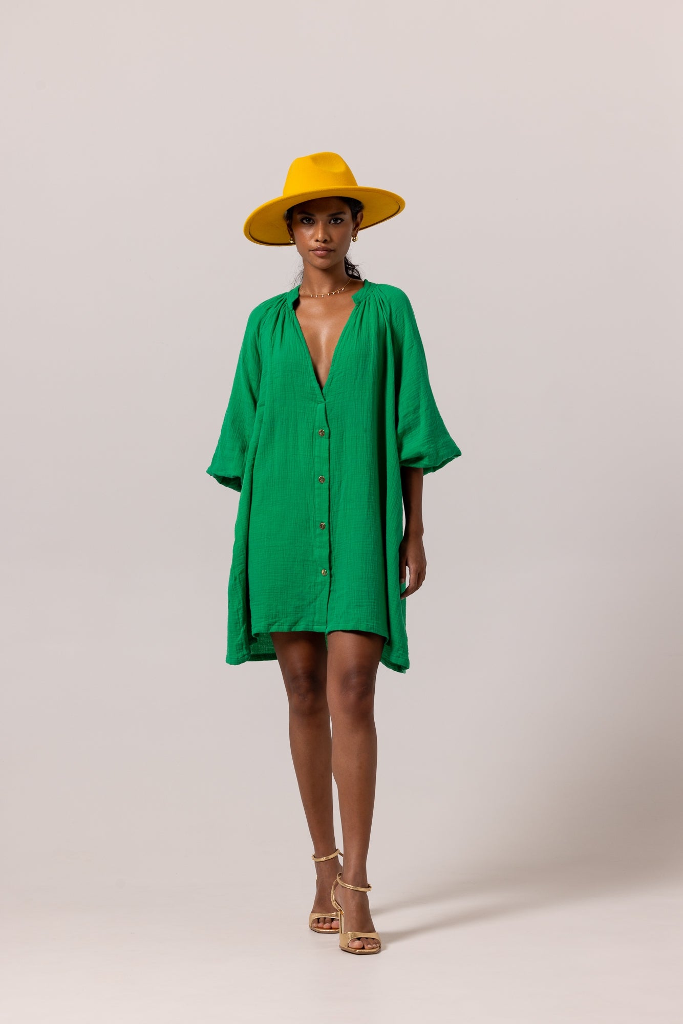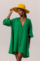 "Une journée sans effort nécessite une robe chic sans effort que vous pouvez enfiler et avoir l'air magnifique néanmoins. Présentation de la MINI-JUPE LA PLAGE qui sera certainement votre prochain incontournable de votre garde-robe. Décolleté en V profond pour flatter votre silhouette supérieure, manches 3/4 et coupe ample. Polyvalent mais moderne avec une couleur verte glamour.