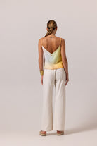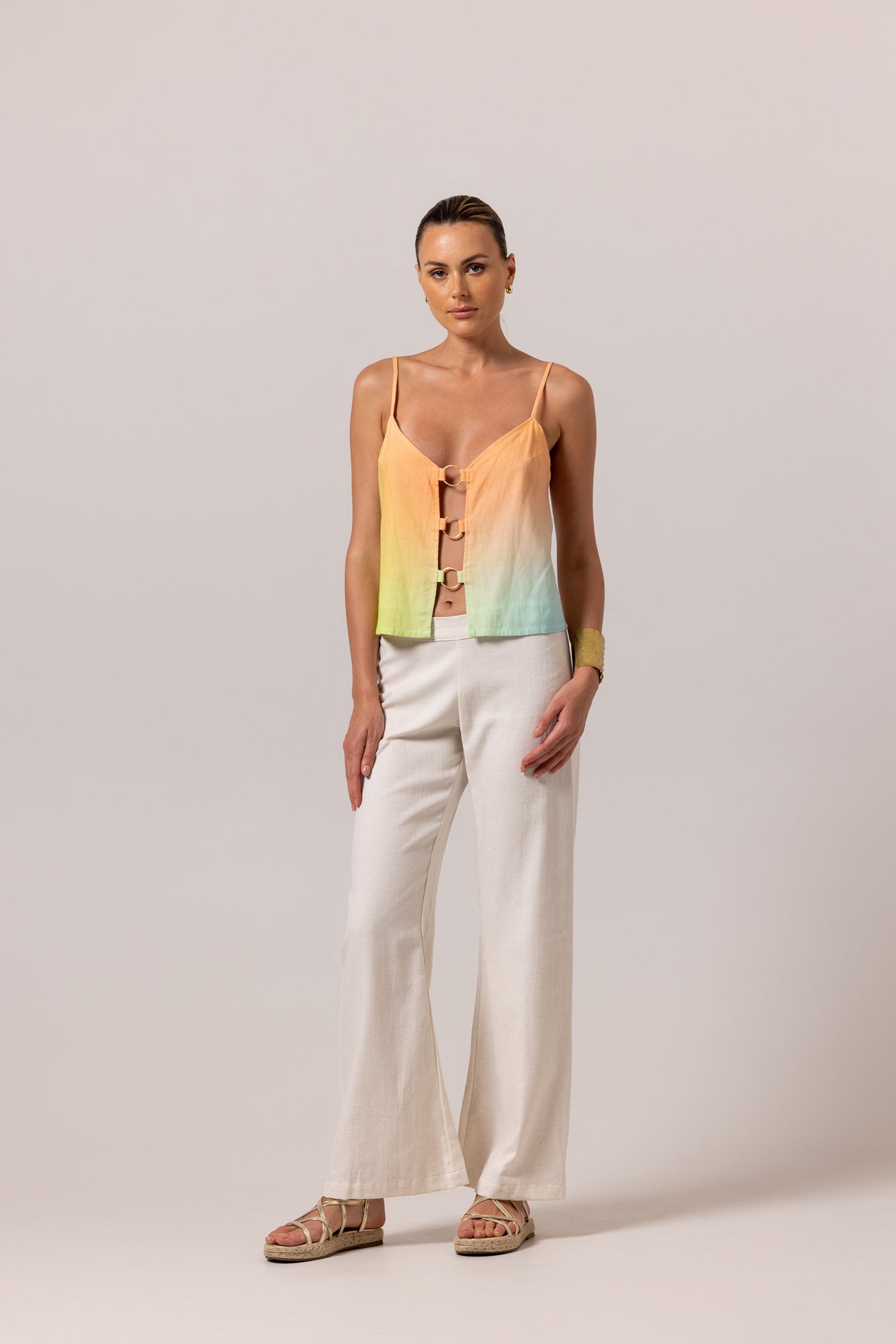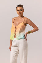 "Le haut NADYA est conçu pour être un modèle à enfiler sans effort que vous pouvez porter aussi bien pour une tenue habillée que décontractée. Bretelles fines, les revers avant sont séparés par une découpe au centre et assemblés par des triples joints toriques. Donnez une touche de sophistication dans la simplicité. Le dos est coupé en V pour flatter votre silhouette et perfectionné par une incroyable couleur dégradée inspirée du coucher de soleil.