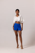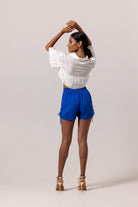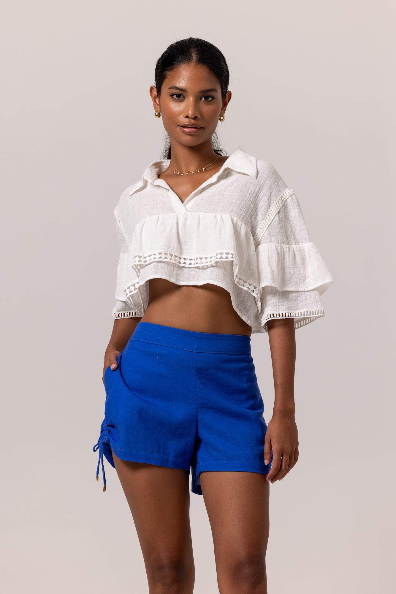 « Préparez-vous à montrer votre côté féminin divin avec le haut RUFFLE de couleur bleue. Le corsage est combiné par une couche à volants avec une bordure au crochet. La même bordure est également ajoutée aux manches et aux emmanchures pour une touche douce. Il est disponible en longueur courte pour vous aider à créer l'illusion d'une taille cintrée. Le look général est exceptionnellement romantique et soigneusement conçu.