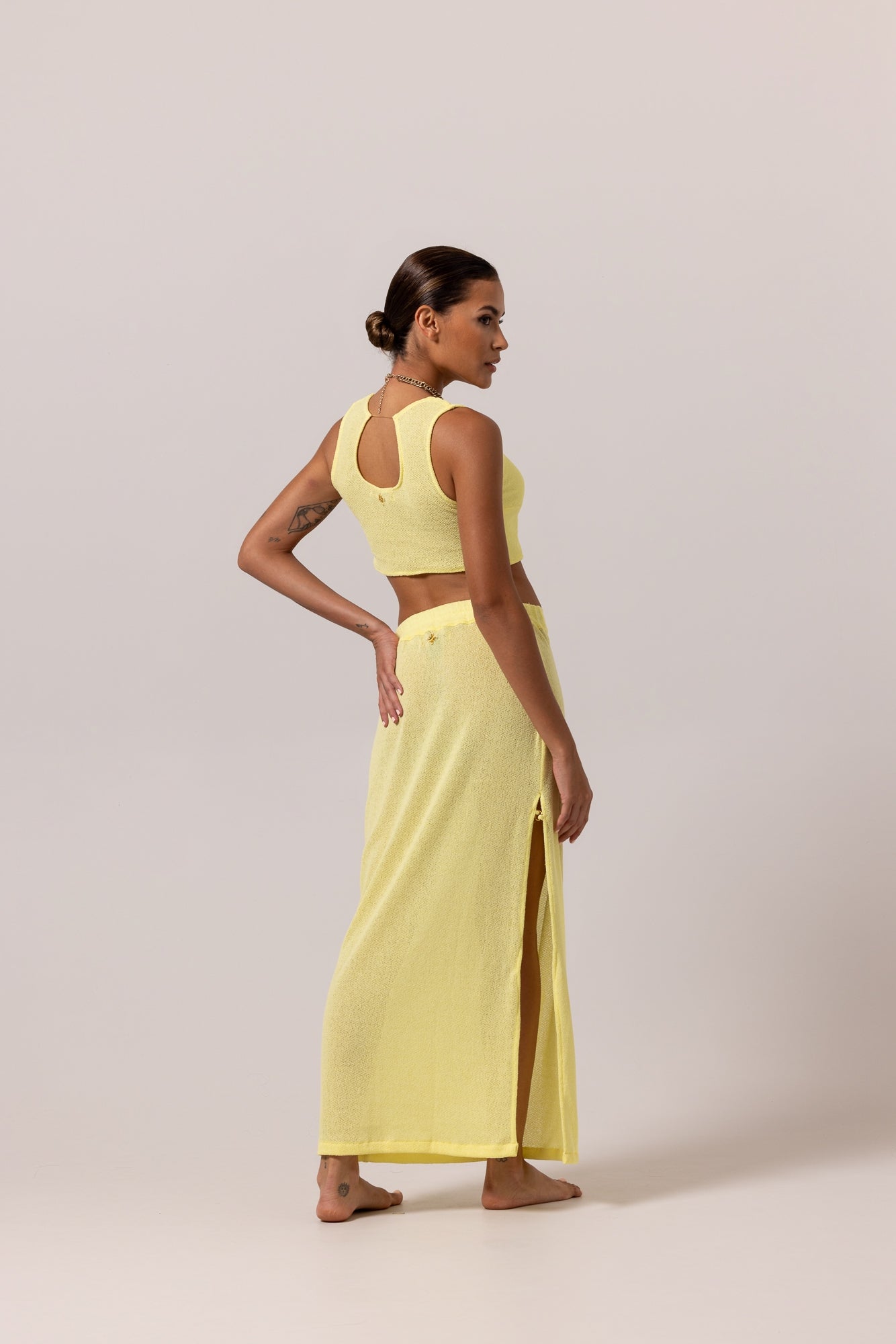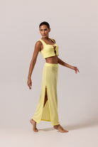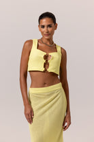 Découvrez le charme de la vie de villégiature avec le SWEETHEART TOP de couleur ivoire. Conçu pour être votre choix préféré pour un usage quotidien, nous utilisons le tissu le plus doux sur votre peau. La découpe sur le devant et les attaches à anneaux ajoutent une touche de glamour contemporain de manière très simple. Disponible dans une couleur jaune pâle pour correspondre à vos pantalons ou jupes préférés.
