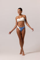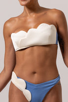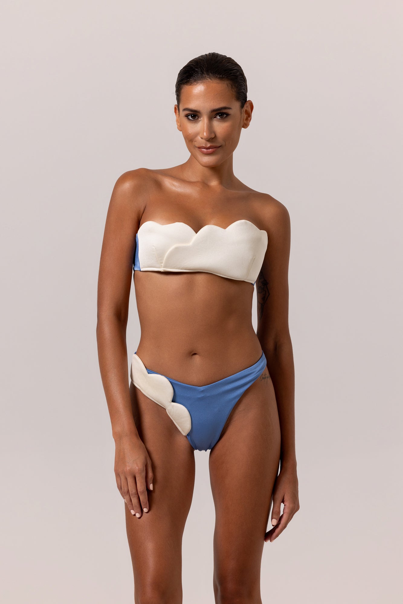 "Un doux nuage ? Une vague d'écume ? À vous de choisir. Le bikini CIELO 2P est définitivement fait pour célébrer l'été de manière ludique. Fabriqué dans un tissu doux, les formes festonnées donnent une touche mignonne à cet ensemble bandeau et culotte facile à porter.