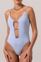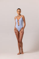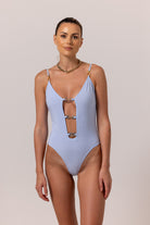 Le maillot de bain une pièce PANAMA n'est pas un maillot de bain ordinaire. La découpe profonde en forme de U sur le devant est ornée d'anneaux transparents qui donnent un point focal élégant. Confortable à porter toute la journée comme uniforme de piscine ou de plage grâce au tissu doux de couleur bleu clair et aux fines bretelles qui flattent vos épaules.