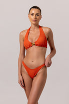 Notre bikini MON SOLEIL est classique et sans effort, pas étonnant que tout le monde l'adore. Le col licou facile à porter et le fermoir arrière garantissent vos mouvements libres dans l'eau ou danser lors d'une fête au bord de la piscine. Livré avec une couleur orange vif de tissu froissé qui donne une texture douce à votre "Peau Douce".