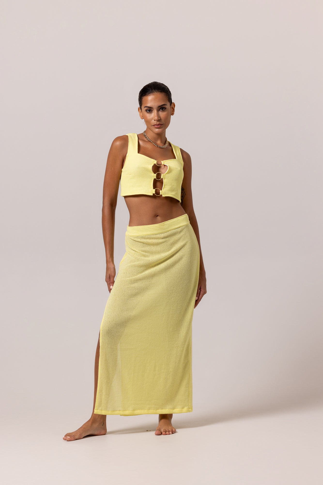 BELLA skirt is a must for your resort dress code. Comes in a sarong-style, you can use it easily as a cover up yet still look posh enough to roam around the luxury lounging. The fabric is comfy, light-weight and soft on your skin in a pretty pale yellow color that goes amazing with every skin tone.
