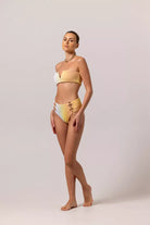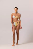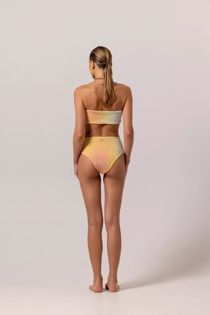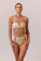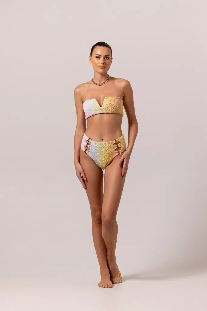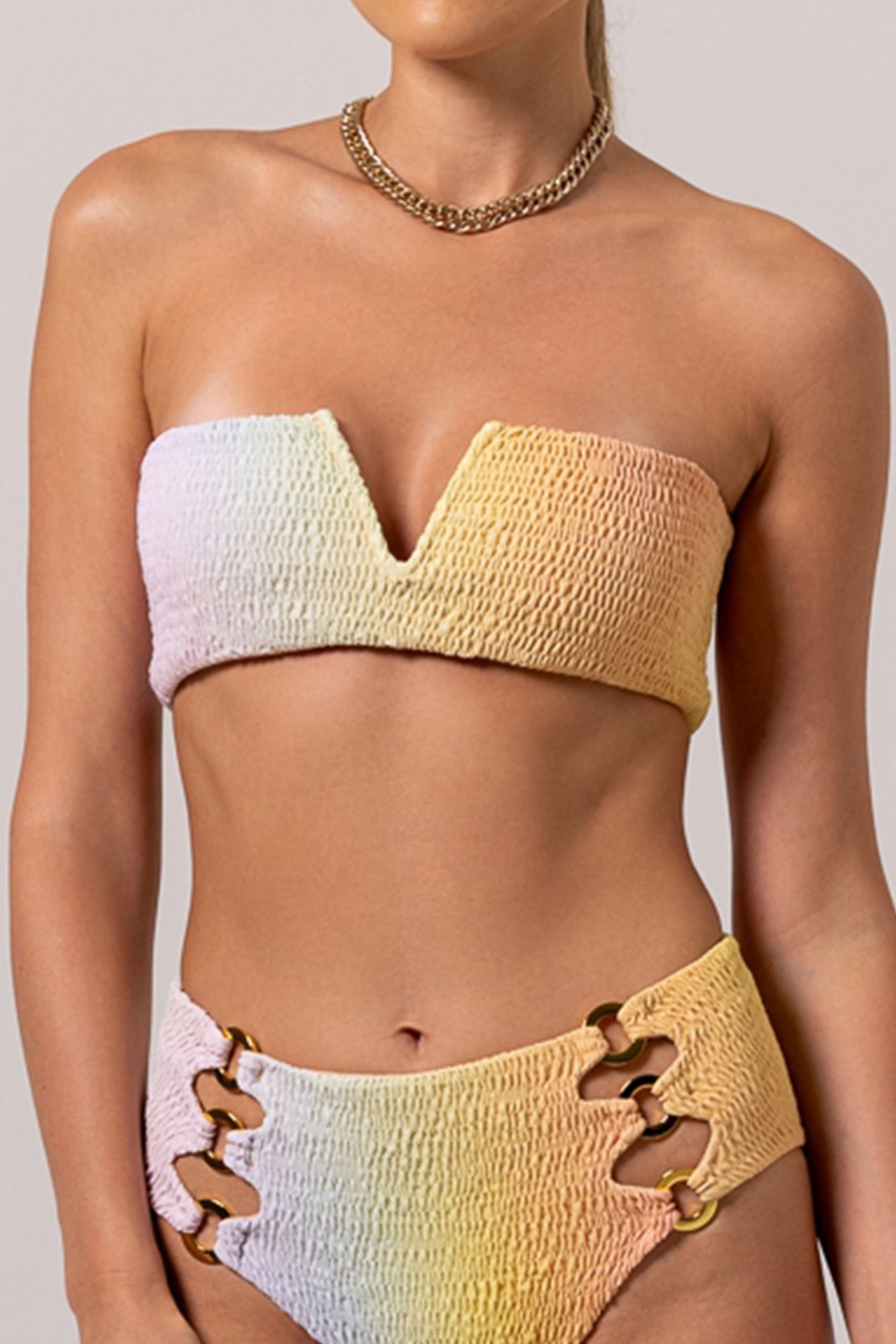 Turn up the heat in our gorgeous JULIETTE LAURA bikini in rainbow-like ombré color! Comes with a smocked fabric, the bandeau has an outstanding V cut to bring you a sexy chic cleavage. Pair with the high-waist panties with accessorized cut-out details.