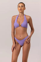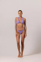 Our MON SOLEIL bikini is classic and effortless, no wonder everyone loves it. The easy-to-wear halter neck and the back clasp guarantees your free moves in the water or dancing on a fun pool party. Comes with a jolly purple color of crinkle fabric that gives a soft textures to your "Peau Douce".